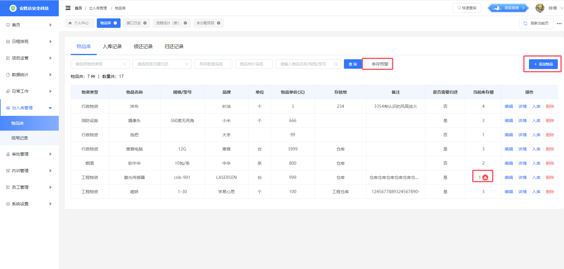若当前库存量低于设定的库存预警值,列表上显示预警提醒。