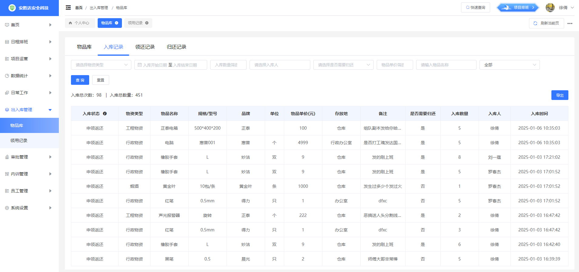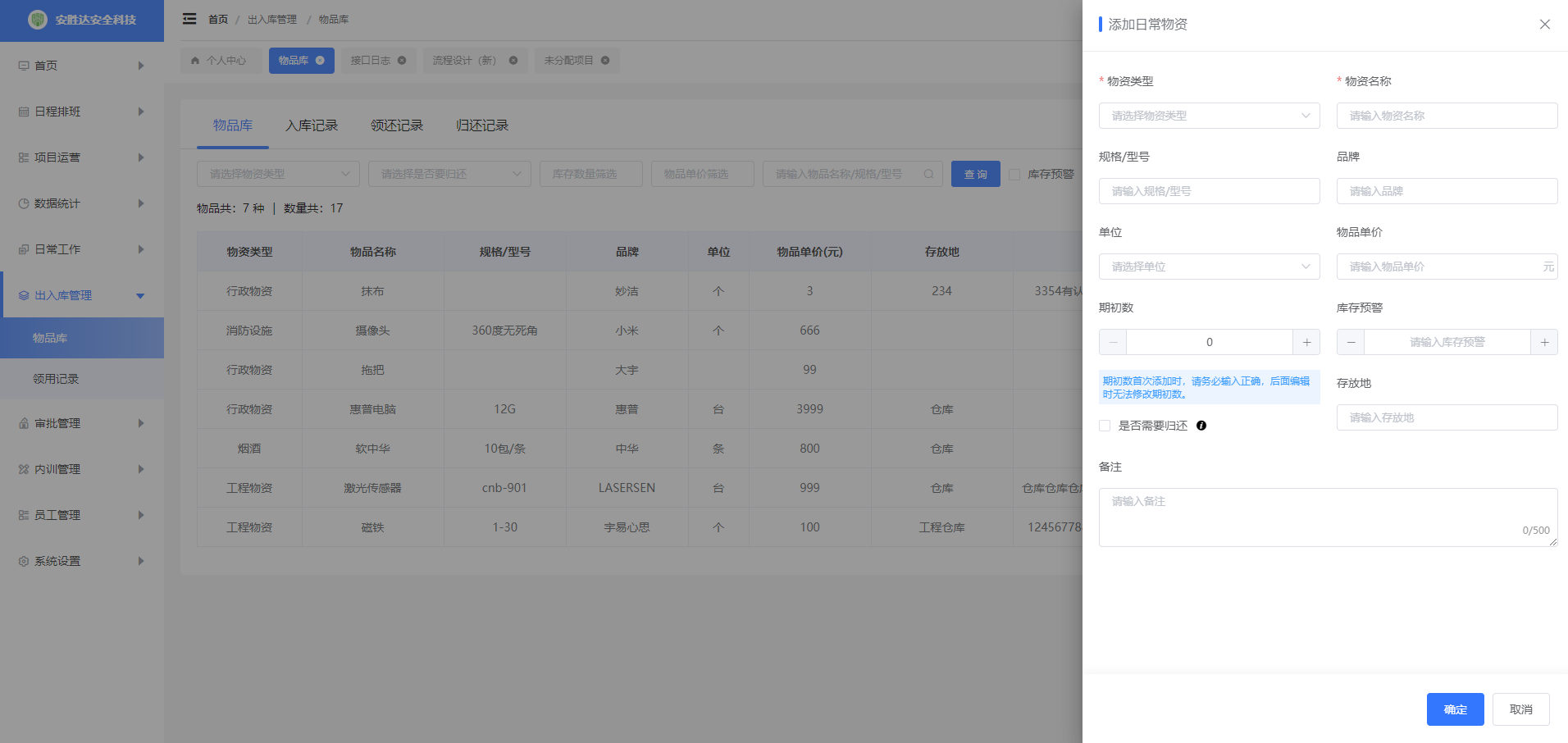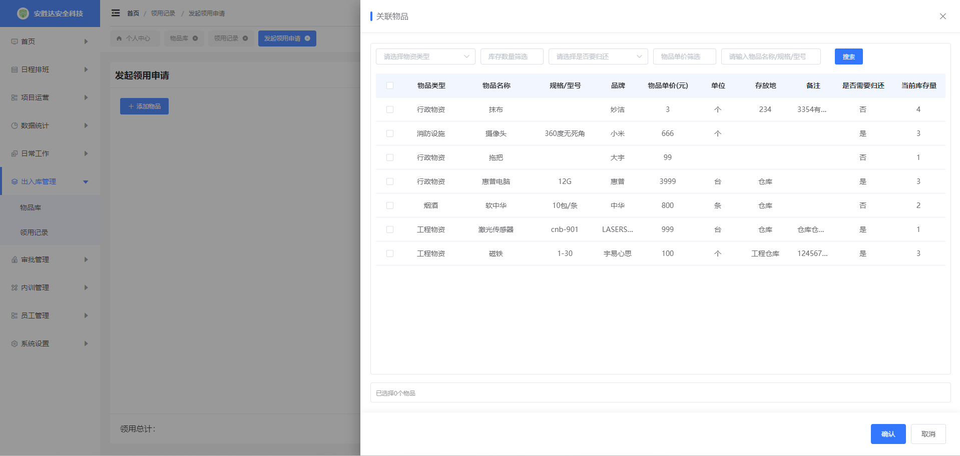 物品库:指定部门负责人有该菜单权限,可以对自己部门的物品进行管控,对物品的新增、后续的入库、领用申请的审批、归还由负责人来操作。