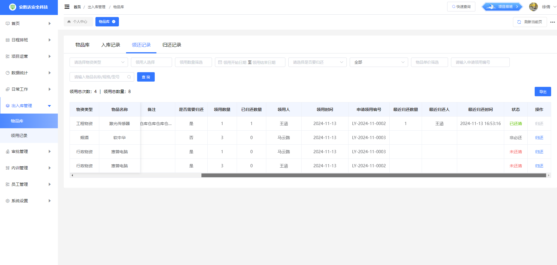 领用申请单审核结束后,才会在领还记录中生成数据。通过筛选条件筛选出符合条件的领还信息,有导出功能。
