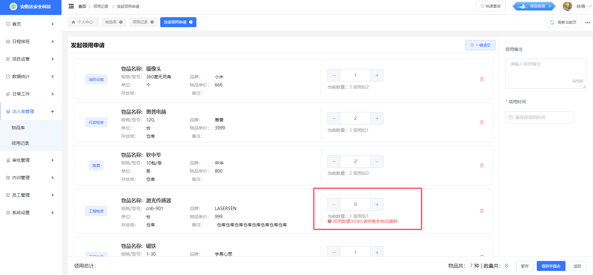 2.1.2物品选择好后,在该页面设置领用数量。注意:当领用数量为0时,请将整条物品删除。