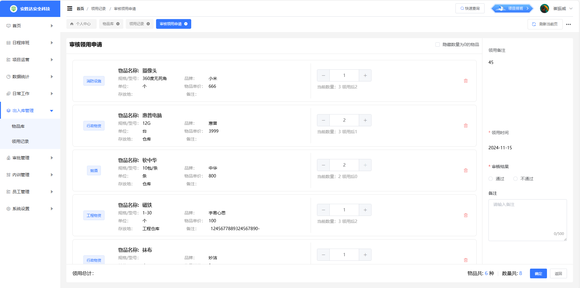 领用记录:由申请人在领用列表中发起领用清单,提交后由审核人审核。不同物资类型的审核人不一样,跨越多个物资类型的,需要对应负责人员都审核通过