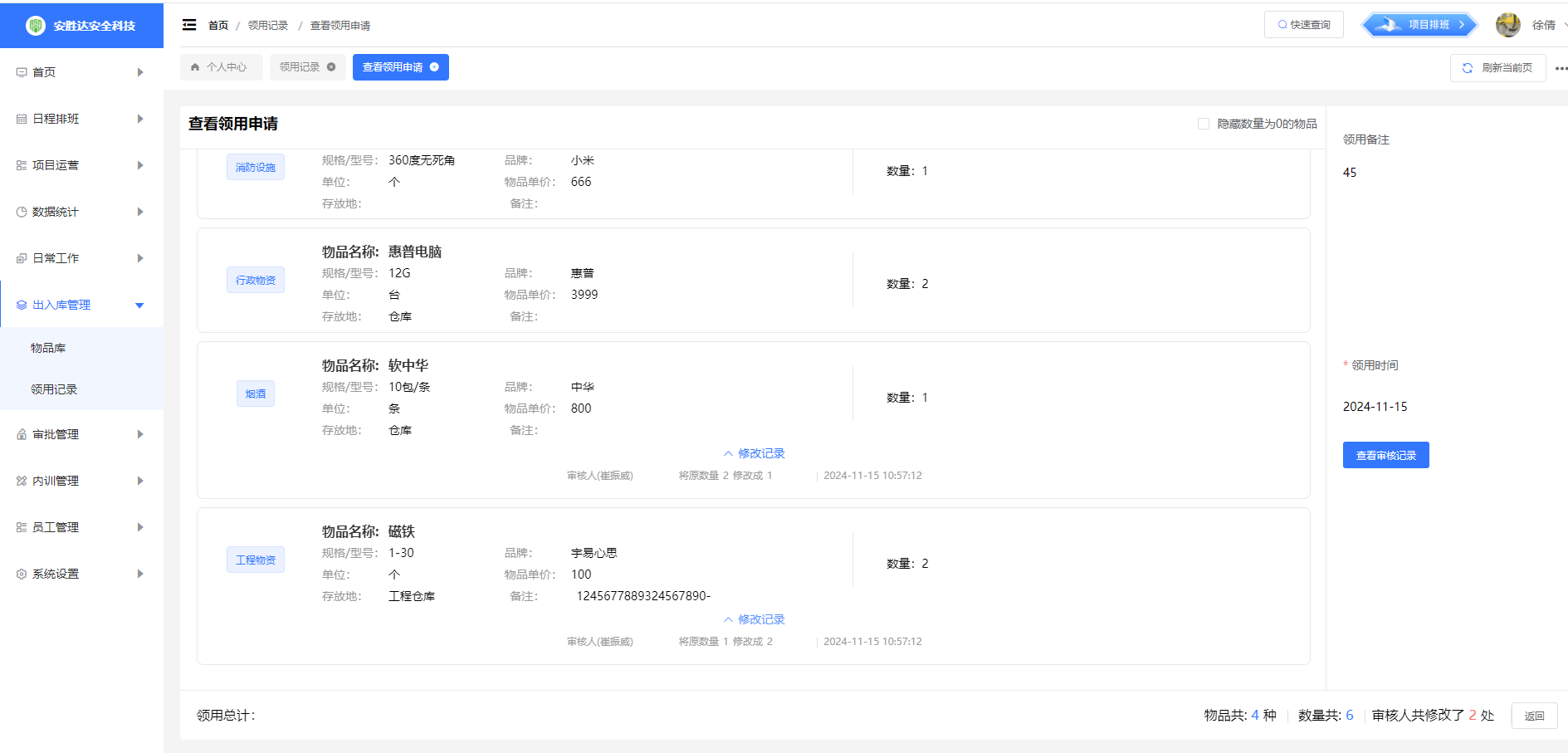 发起人在我收到中查看详情,点击“修改记录”可看到审核人对领用申请的修改情况。