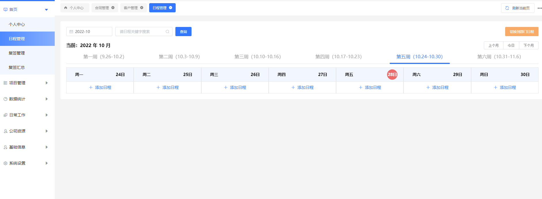 2.2日程管理:对本周、下周或者将来的日期添加相关日程。录入日程后可用于业绩结算。