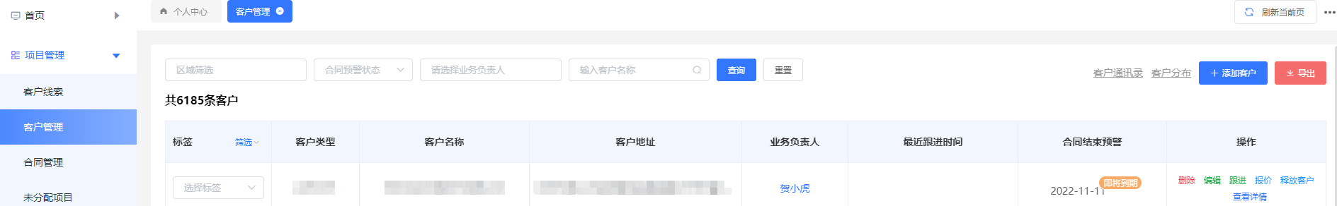 对客户的日常跟进在跟进中维护,后期合同快到期,或没有定期跟进都会有预警提醒。