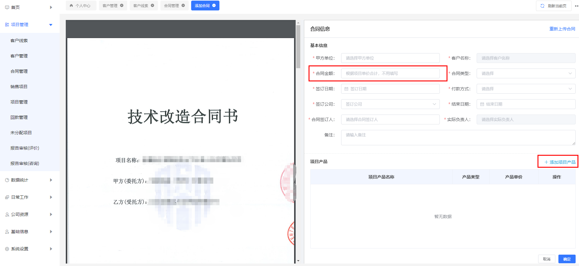 3.3合同管理:报价之后,签订了合同,在合同中点击“添加合同”。上传合同附件,注意“合同金额”不用填写,在“添加项目产品”时会自动累计。这边的逻辑是:一个客户可能会有多个合同,一个合同可能会有多个项目。