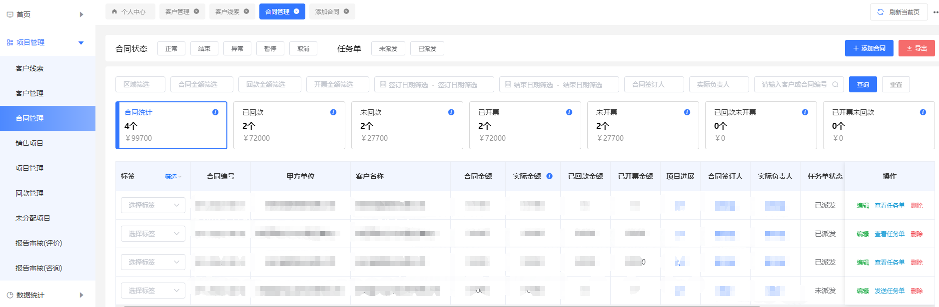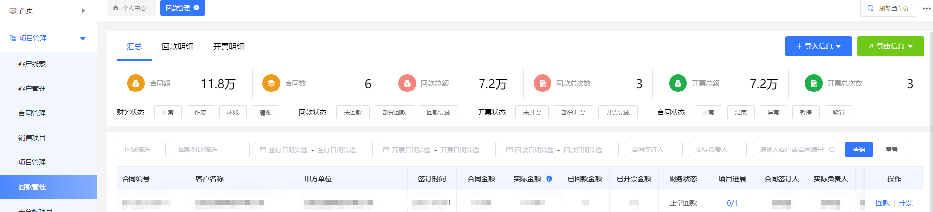 3.7回款管理:当项目结束后,就在回款管理中跟进回款信息和录入开票信息。添加完后可在回款明细和开票明细中查看单笔记录;汇总信息在汇总模块中查看。