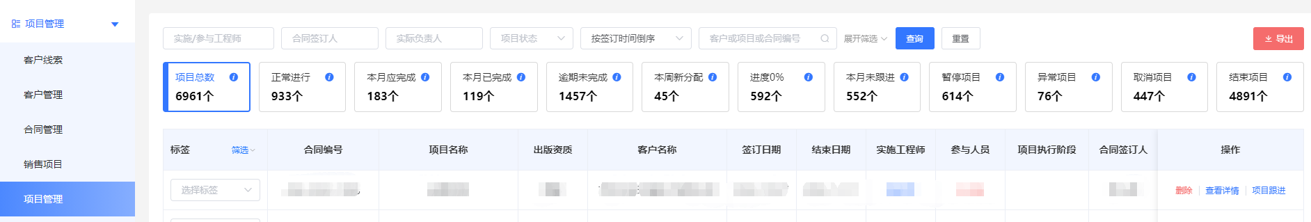 4.2项目运营:是从跟进、逾期、项目状态、完成情况、项目类型这几个维度来统计的。