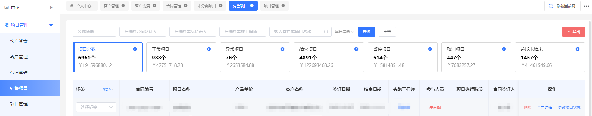 3.5销售项目:销售人员在销售项目中跟进,如果有异常或者暂停的项目也需要销售跟进,也会出现在“首页-个人中心”的待办提醒中,以便清晰直观看到,方便及时处理。