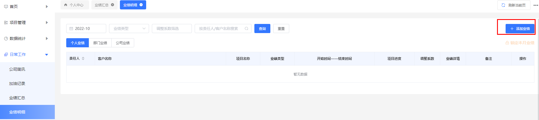 5.3业绩明细:选择要计入的月份,选择对应的日程,可添加多条、可修改对应的调整系数,用于业绩结算。月底锁定本月业绩;就到部门业绩,部门负责人审核本部门的业绩,审核完后锁定;就到公司业绩,由公司领导审核,审核完进行公司的结算。