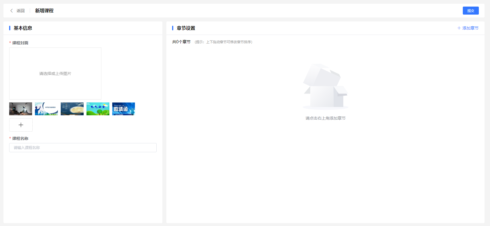 配置课程,点击“新增课程”,设置封面、课程名称,添加章节名称和视频。