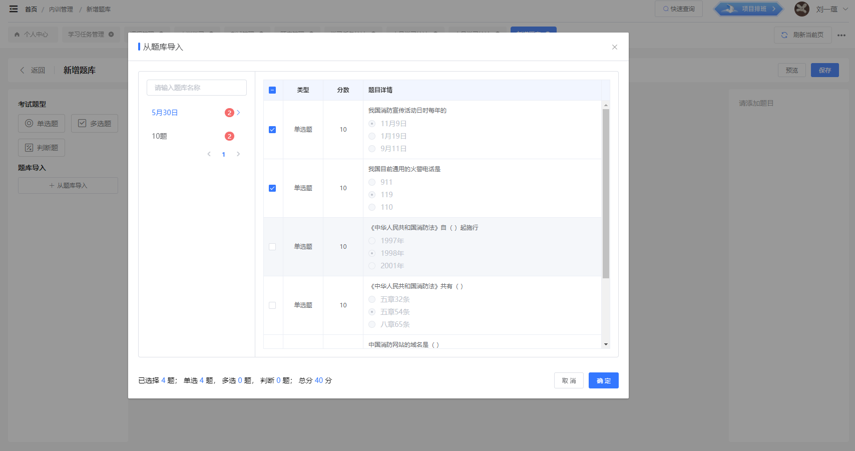 2.1设置题库。点击“新增”,可直接创建题目,也可从题库中选择题目。可预览题库。