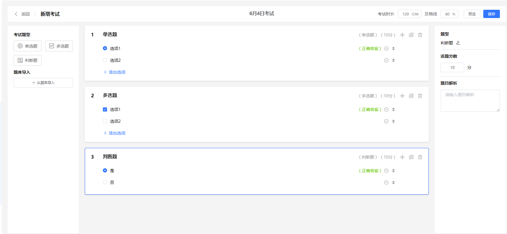 3.2 设置试卷名称、考试时长、及格线比例。可预览试卷题目。
