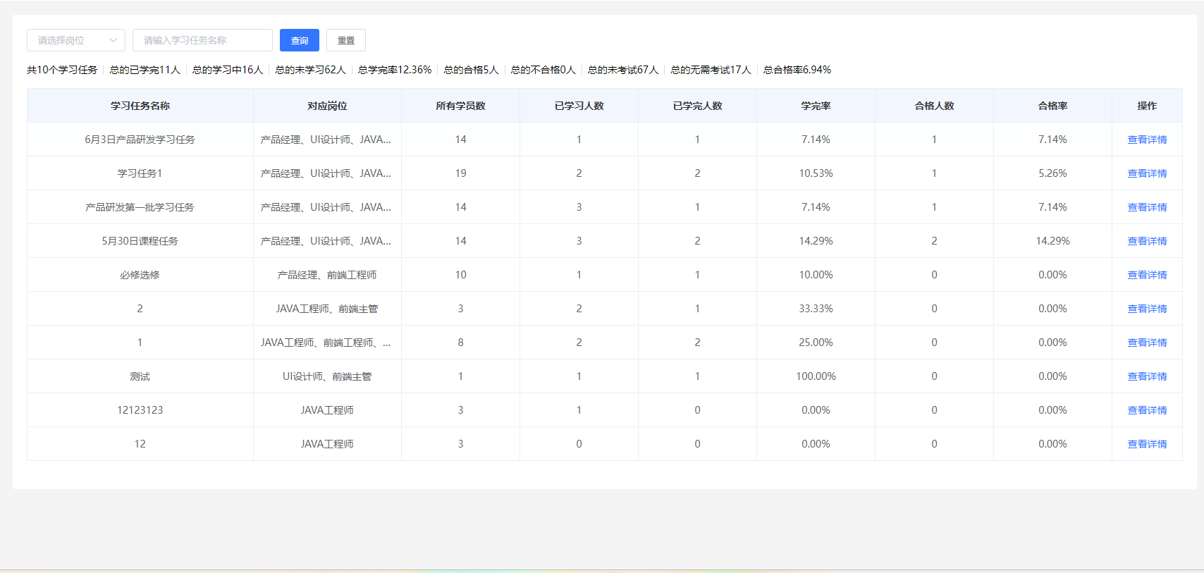 6.1 以学习任务为维度,查看当前任务下学员学习的情况:已学人数、已学完人数、学完率以及合格率等。