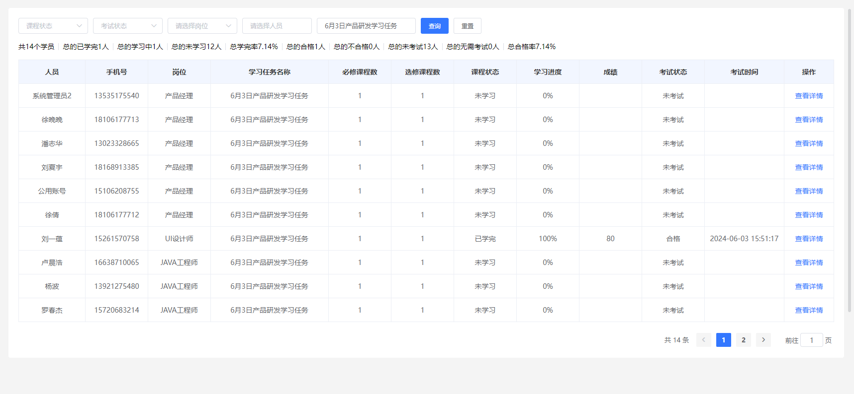 7.1 以人员未维度查看学习情况。若一个人有多个学习任务,那么就有多条数据。