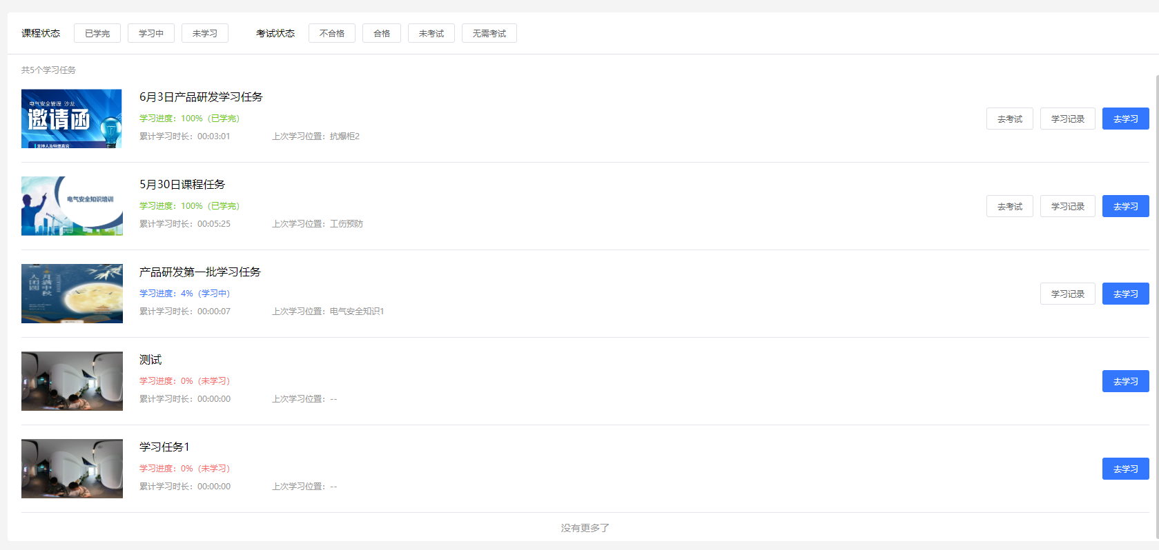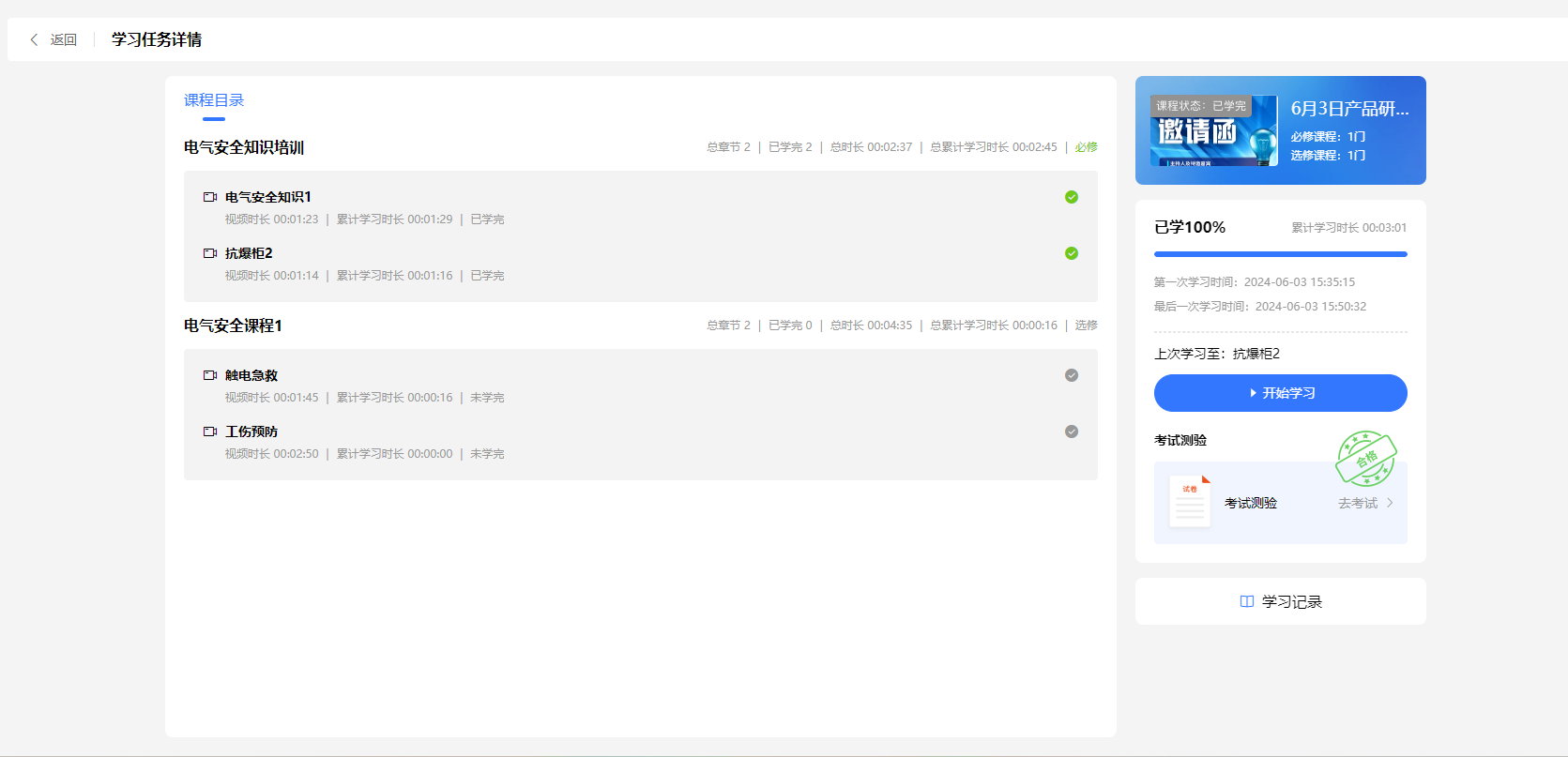 当必修课程全部学完后,方可知晓是否需要考试,若需考试,则点击“去考试”按钮。学员可查看学习记录和考试记录。