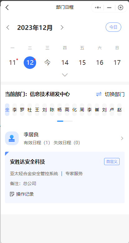 1、默认进来是当天的日期,展示当前部门人员的的所有日程,也可选择具体人员,或者切换部门查看其他人员的日程信息。