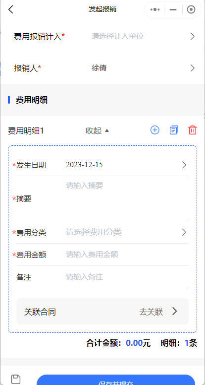1.2、发起报销时,选择费用计入单位,报销人默认就是自己,填写费用明细,红星为必填,可复制或新增一条费用明细。费用若为某个合同下产生的,则需关联合同。