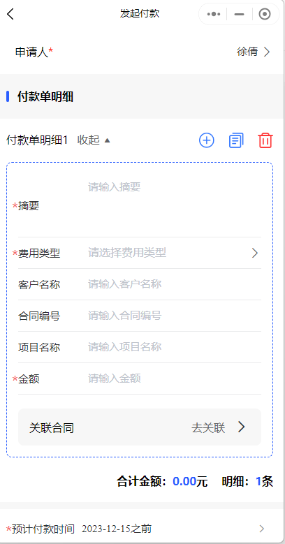 2.2、发起付款时,申请人默认就是自己,填写付款单明细,红星为必填,可复制或新增一条付款单明细。付款单若为某个合同下产生的,则需关联合同。填写预计付款时间、收款人账户信息(可快速选择历史收款人)。