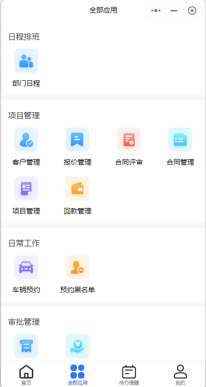 3.2全部应用:包含了日程排班、项目管理、日常工作、审批管理。