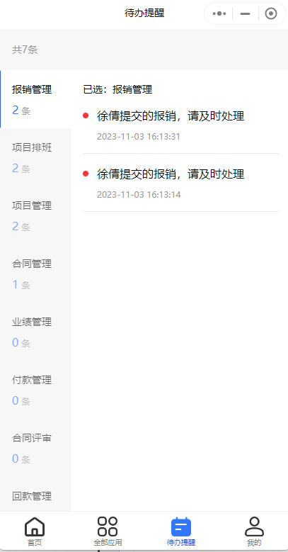 3.3待办提醒:所有模块的相关待办提醒都在这里展示。