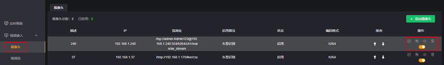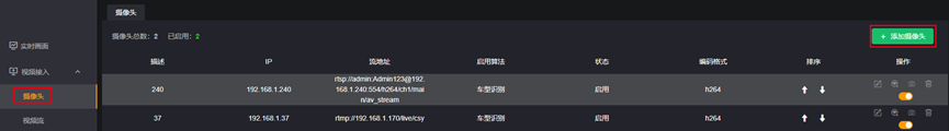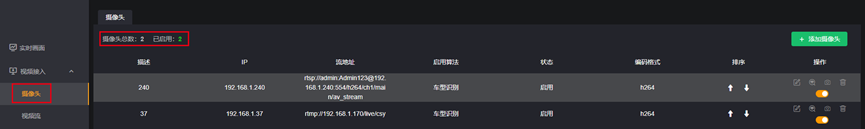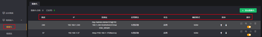 - 摄像头页面显示摄像头描述、摄像头IP、流地址、启用算法、摄像头状态、编码格式、排序以及操作信息。
