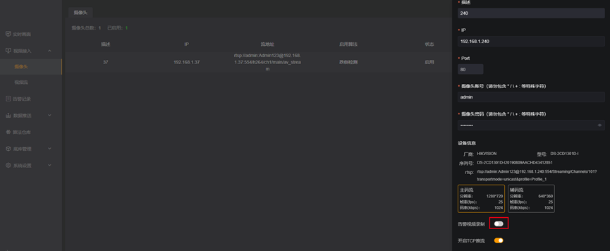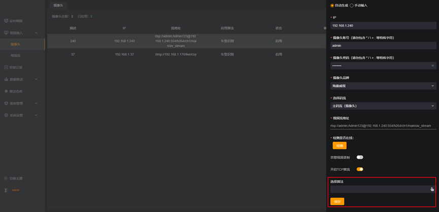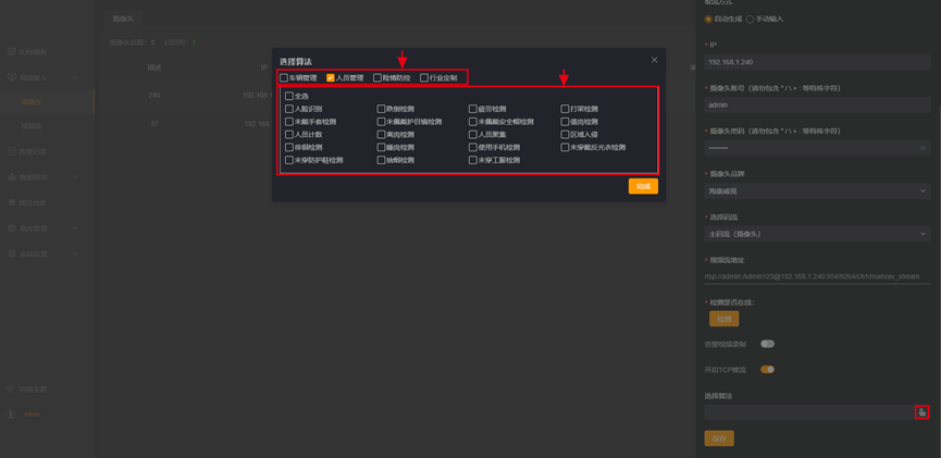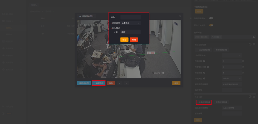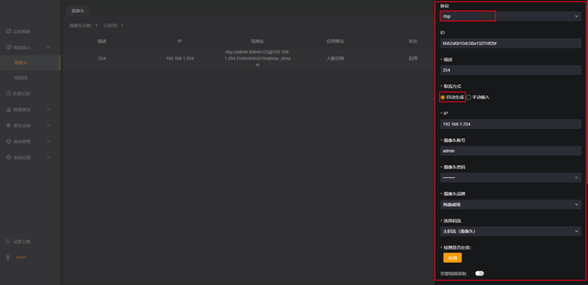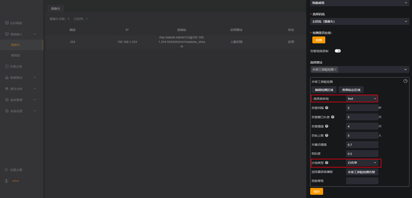 - 点击【视频接入】-【摄像头】-【添加摄像头】按钮,配置摄像头与算法参数。