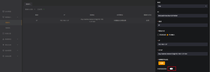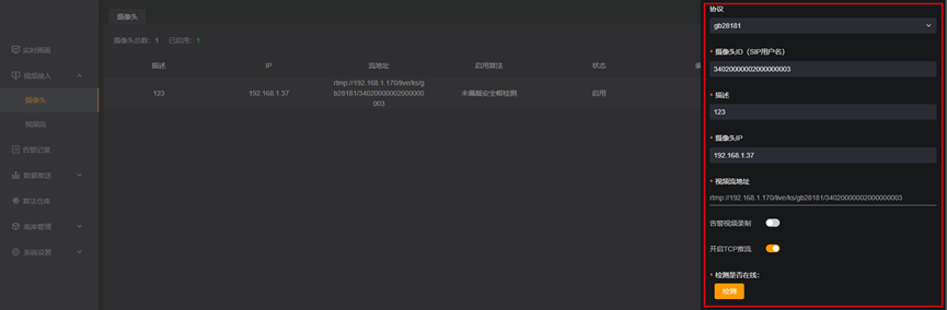 | 检测是否在线 | 填写完成以上内容,点击检测,点击检测,确定是否在线。若不在线,需排查摄像头RTSP流、拉流次数是否异常 |