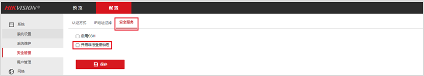 - 登录海康摄像头后台管理系统,在【系统】-【安全管理】-【安全服务】中取消开启非法登录锁定的勾选,并点击保存;