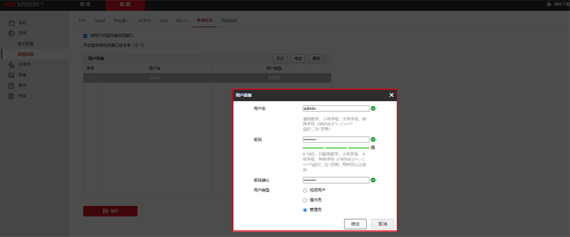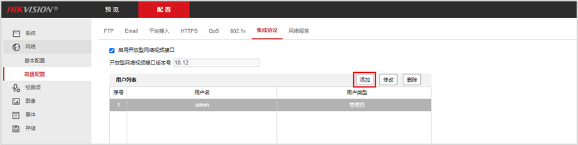 - 在【网络】-【高级配置】-【集成协议】中勾选启用开放型网络视频接口;