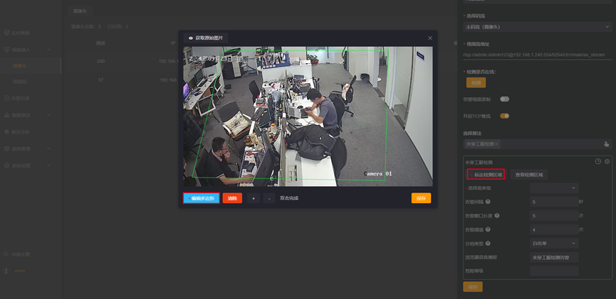 - 部分算法需配置检测区域,点击编辑检测区域,在弹出的画面中点击【编辑检测区域】,依次画点连线,当完成多边形封闭区域后,双击鼠标左键绘制完成。