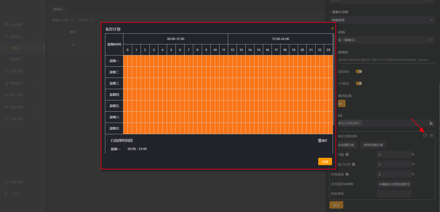 - 布控计划可设置算法生效时间。在算法配置时,点击算法右上角时间图标,设置算法生效时间。默认7*24小时生效。点击黄色区域取消生效时间,或点击弹出界面右下角清空按钮,清屏后,自行拖动选择生效时间。