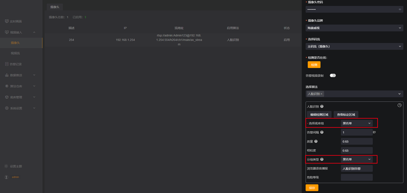 - 人脸识别,选择底库分组与分组类型,若分组类型选择黑名单,则检测结果命中底库产生告警;若底库分组类型选择白名单,则检测结果不在底库中产生告警,即陌生人识别;