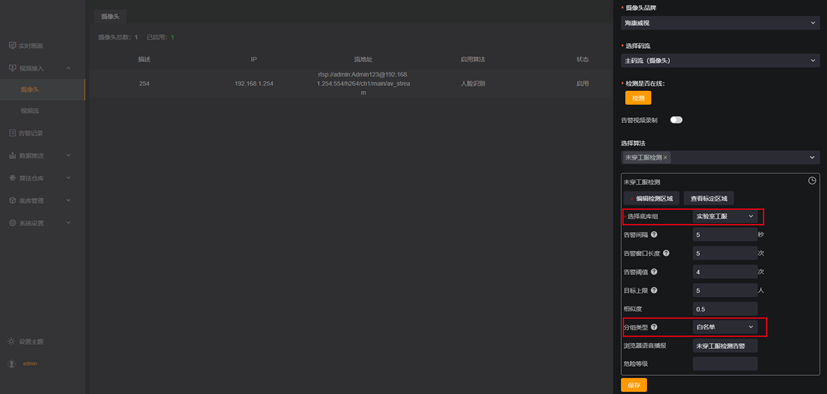 - 未穿工服检测,选择底库组与分组类型,分组类型选择白名单,即检测结果不在底库中产生告警,即未穿工服告警;