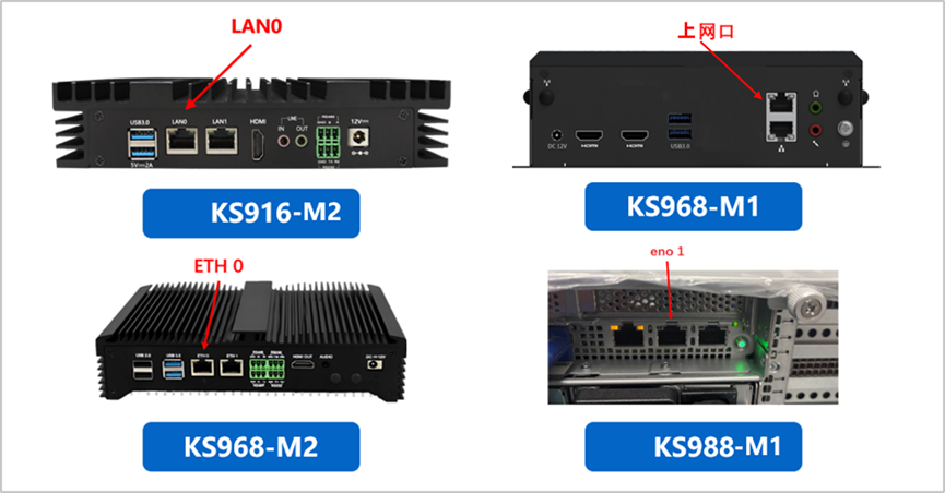 - 根据设备型号明确设备主网口:KS916-M2为左侧LAN0,KS968-M1是上网口,KS968-M2是ETH0,KS988-M1是eno1。(注:产品使用过程中务必保持主网口连接,因为实时画面查看、设备搜索工具IP查找、设备上报IP等功能均绑定主网卡。)
