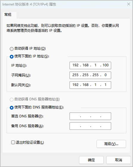 - 在电脑端打开网络设置,点击【使用下面的IP地址】,输入需要设定的IP地址,例如:192.168.1.100;子网掩码:255.255.255.0;默认网关:192.168.1.1,若为win11需将DNS设置为114.114.114.114;
