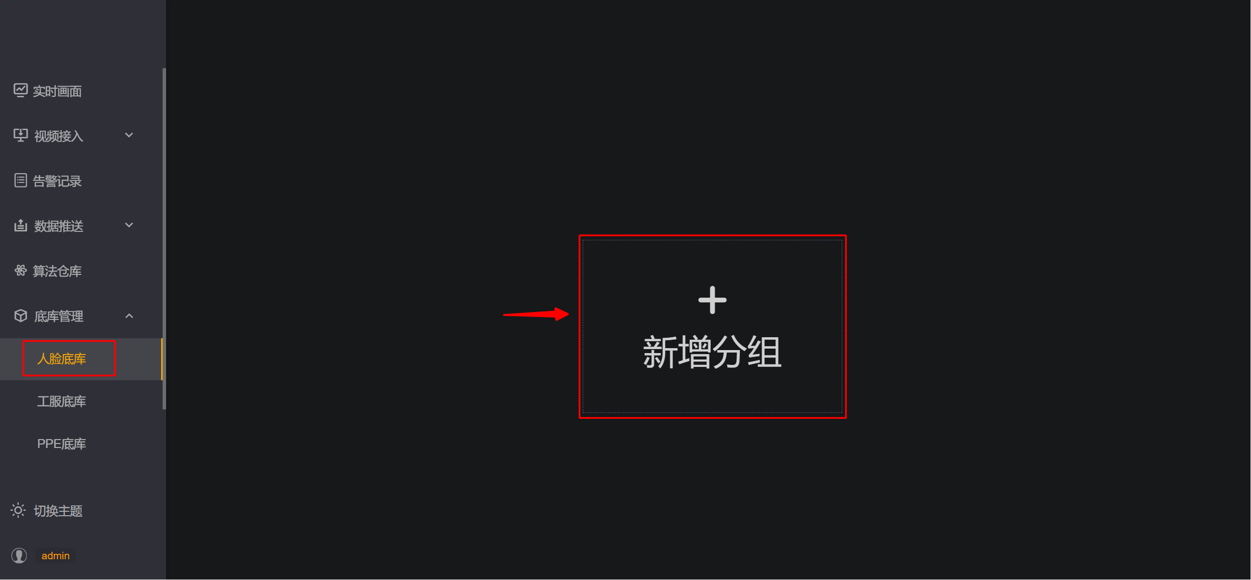 第一步: 点击【底库管理】-【人脸底库】中的新增分组,如下图所示。