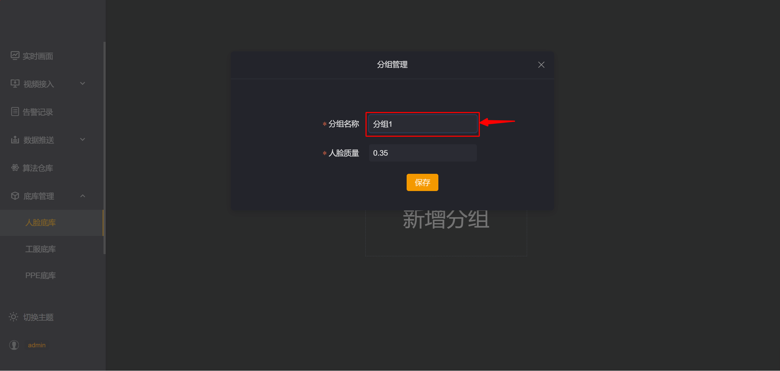 第二步: 在弹出的分组管理页面中输入【分组名称】,如“分组1”,人脸质量得分保持默认值。完成后点击【保存】。