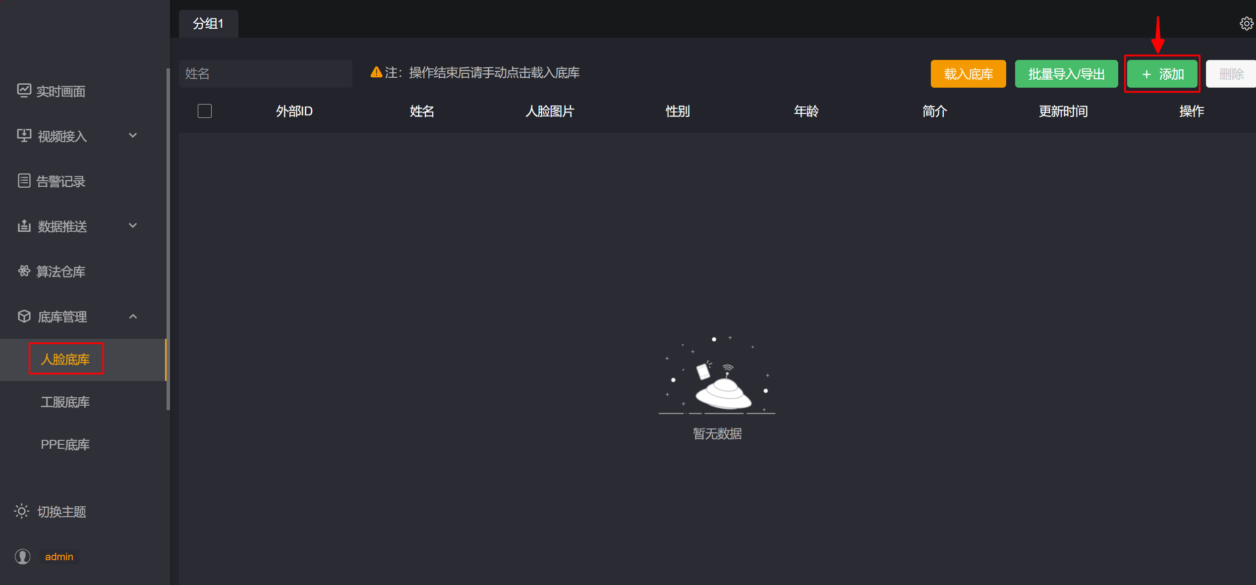 第三步: 在人脸底库页面右上角点击【添加】按钮。