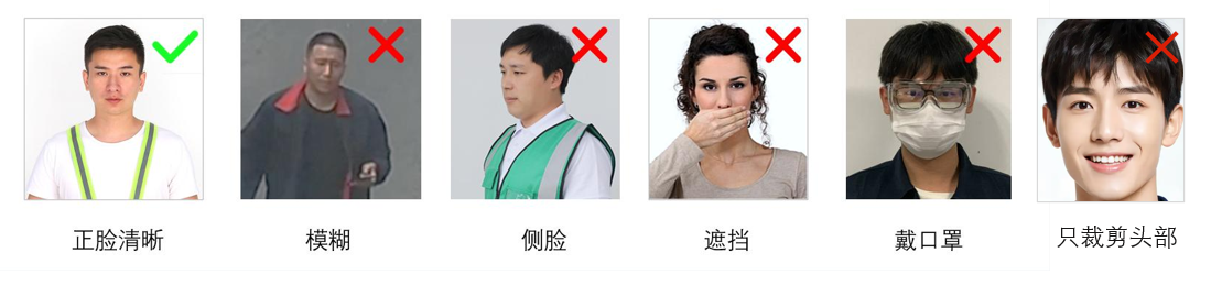 | 禁用场景 | 逆光、强光、弱光、反光等光线条件远距离(>10m)识别条件画质不清晰,无法辨别人脸特征人脸遮挡或部分遮挡 |