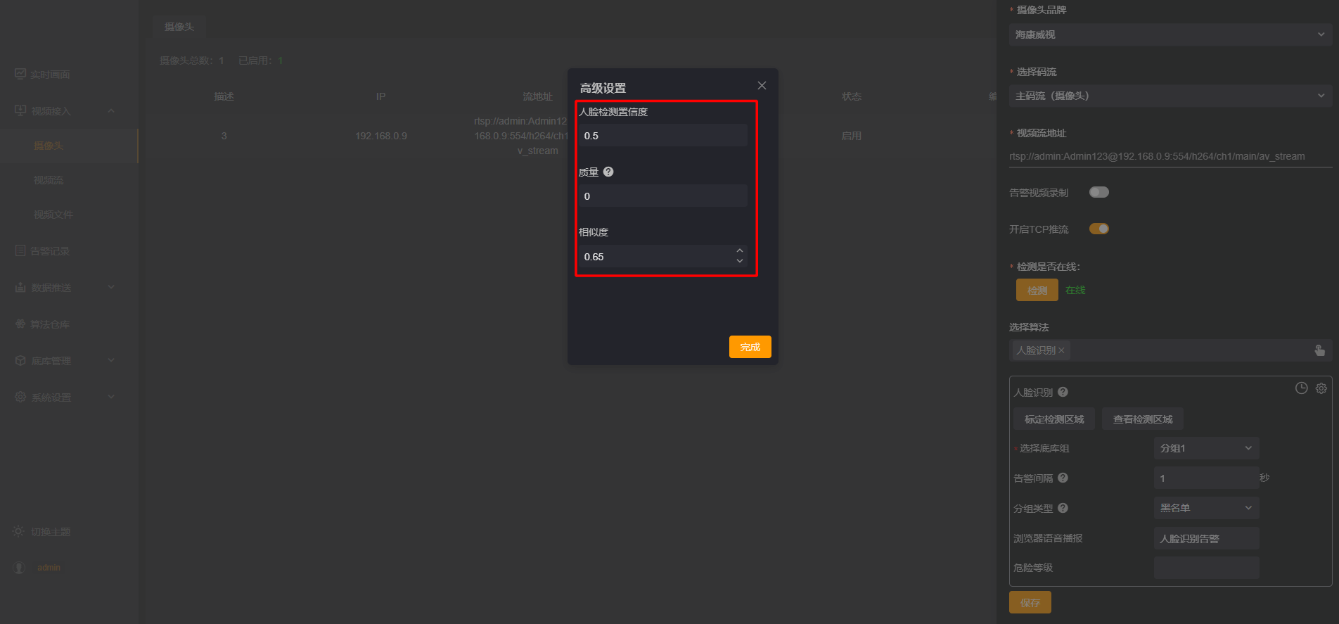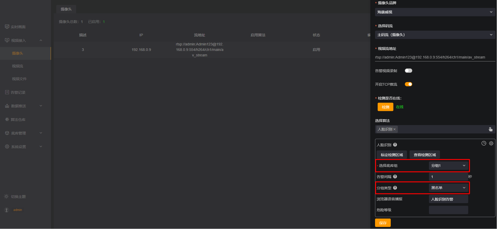 在选择算法中选择【人脸识别】算法,【选择底库组】,如“分组1”,选择【分组类型】:黑名单,完成后点击保存。
