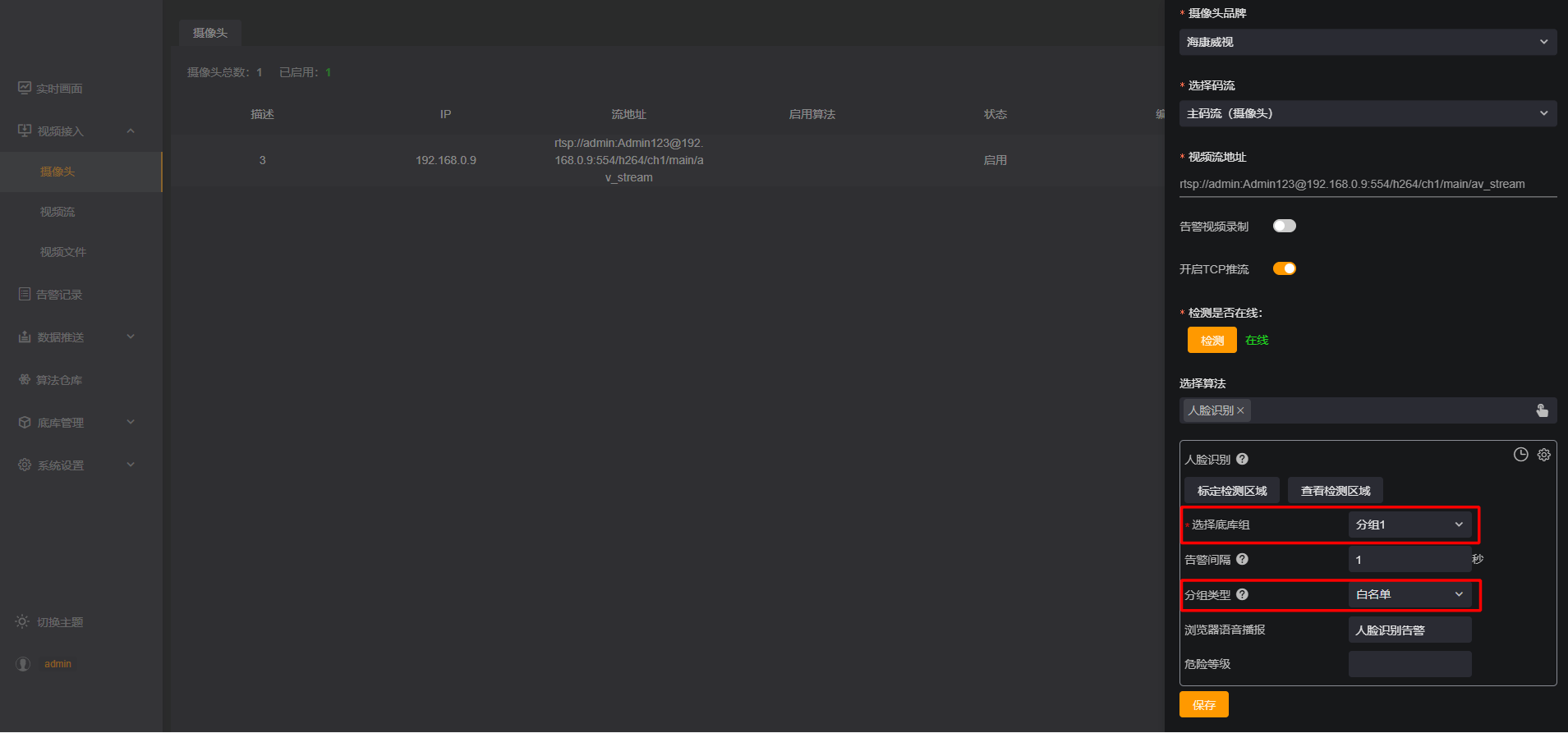 在选择算法中选择【人脸识别】算法,【选择底库组】,如“分组1”,选择【分组类型】:白名单,完成后点击保存。