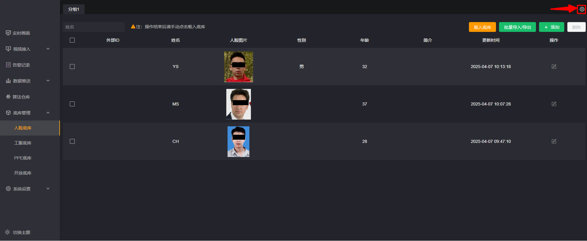 第一步: 点击【底库管理】-【人脸底库】,右上角的齿轮图标。