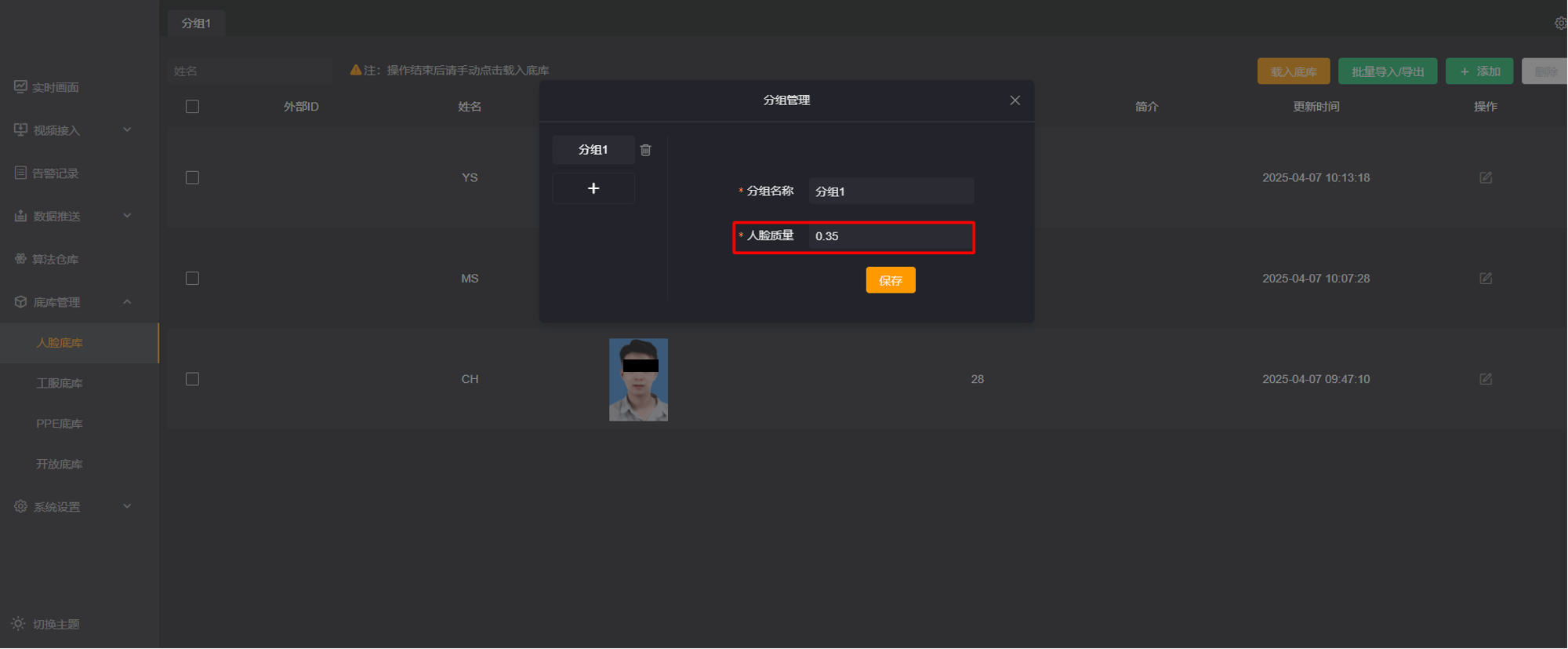 第二步: 在弹出的【分组管理】中,将人脸质量至调低,如0.25。